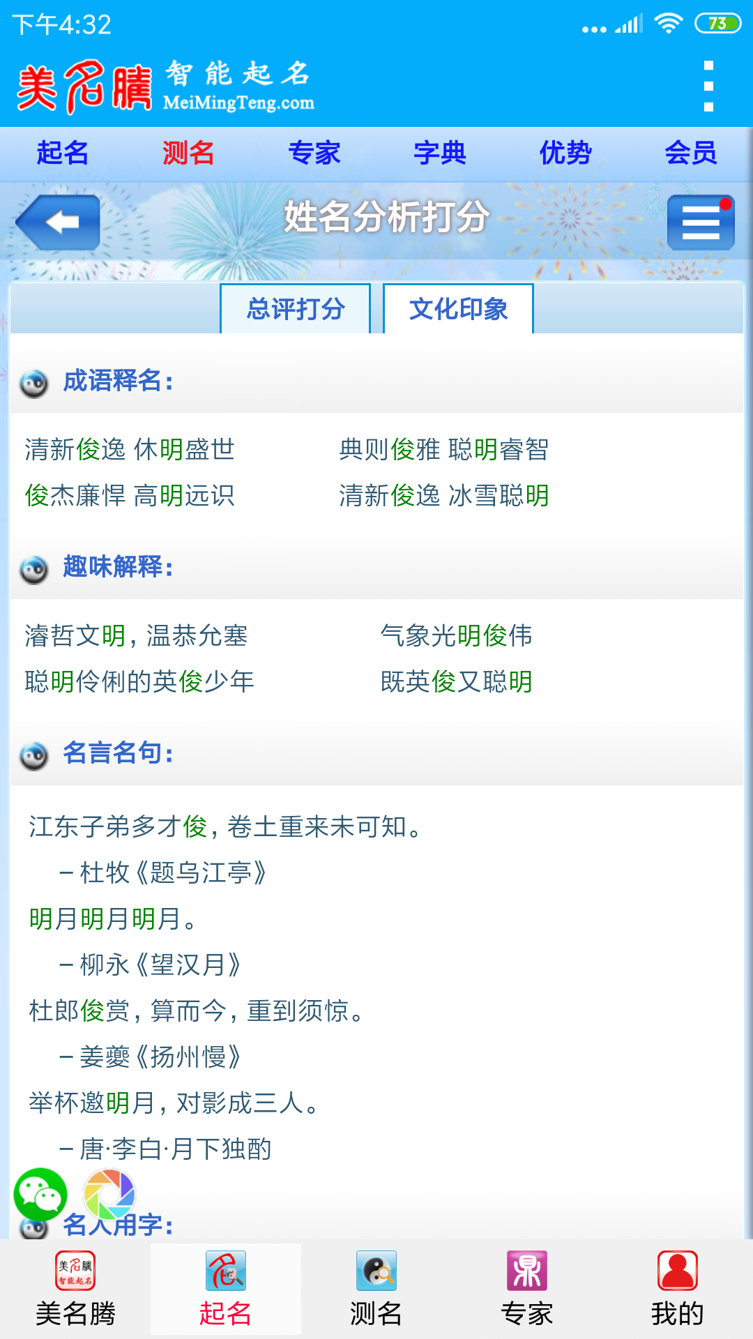 它有一个很实用的功能,就是名字打分。当你看到一个名字时,想知道它好不好,只需要点击打分按钮,软件就会从音韵、寓意、文化等多个方面进行综合评估,给出一个详细的分数和评价。这样你就能更直观地了解这个名字的优缺点。软件还提供了名字的姓氏渊源和历史文化背景介绍,让你在给宝宝起名的也能了解到姓氏背后的深厚文化底蕴。软件还支持分享功能,你可以把选好的名字分享给亲朋好友,让大家一起参与讨论。