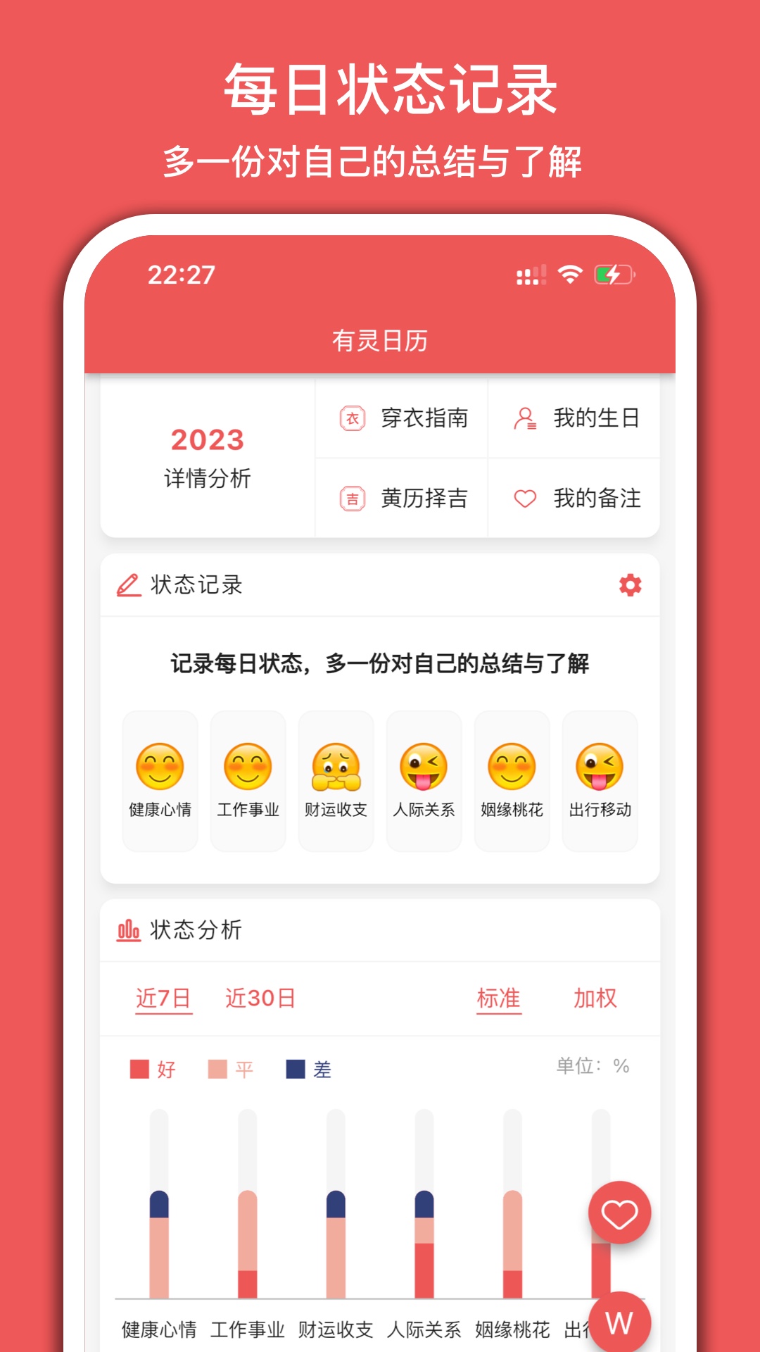 传统万年历部分提供了公历、农历、二十四节气、七十二候、节假日调休安排、干支纪年、星座以及时间进度等完备的日期信息查询。随手记账日历功能允许便捷地记录每一笔收入与支出,并支持对当日、当月及当年的财务状况进行统计与查阅。针对女性健康管理,内置的女生经期日历能以极简的方式记录相关数据,并预测未来经期与推算排卵期。对于工作安排,其排班倒休日历支持自定义班次记录,方便统计各类班次数据。它还包含了心情状态记录、时光笔记、重大事件倒计时与正计时提醒等辅助功能。在主日历界面,可以通过订阅中心自主选择展示各类实用功能的预览卡片,例如黄历择吉信息。产品还持续更新与完善一个名为生活广场的板块,集成更多生活小工具。其专业功能延伸至基于中华传统文化的领域,提供了精确到秒的四柱八字排盘工具,并在流日、流月、流年维度提供基于个人生日的运势节点分析与深度运势报告。
